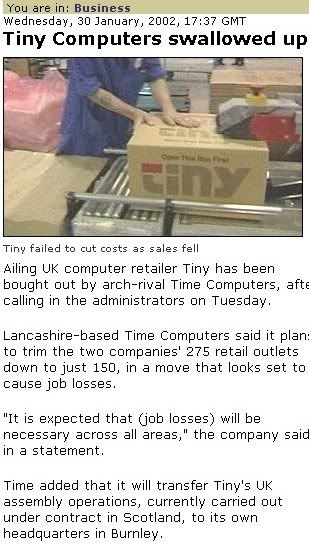 I mention this because I used to work for Tiny (well, indirectly) and lost my job as part of the first stage of this saga in 2002. The company sold cheap, nasty PC's which were under-specced. Their support service wasn't particularly good and there wasn't anything that seperated them from the competetition. In customer satisfaction surveys they generally came second bottom (to Time, who came bottom). They were then bought by Time, as the article then shows.